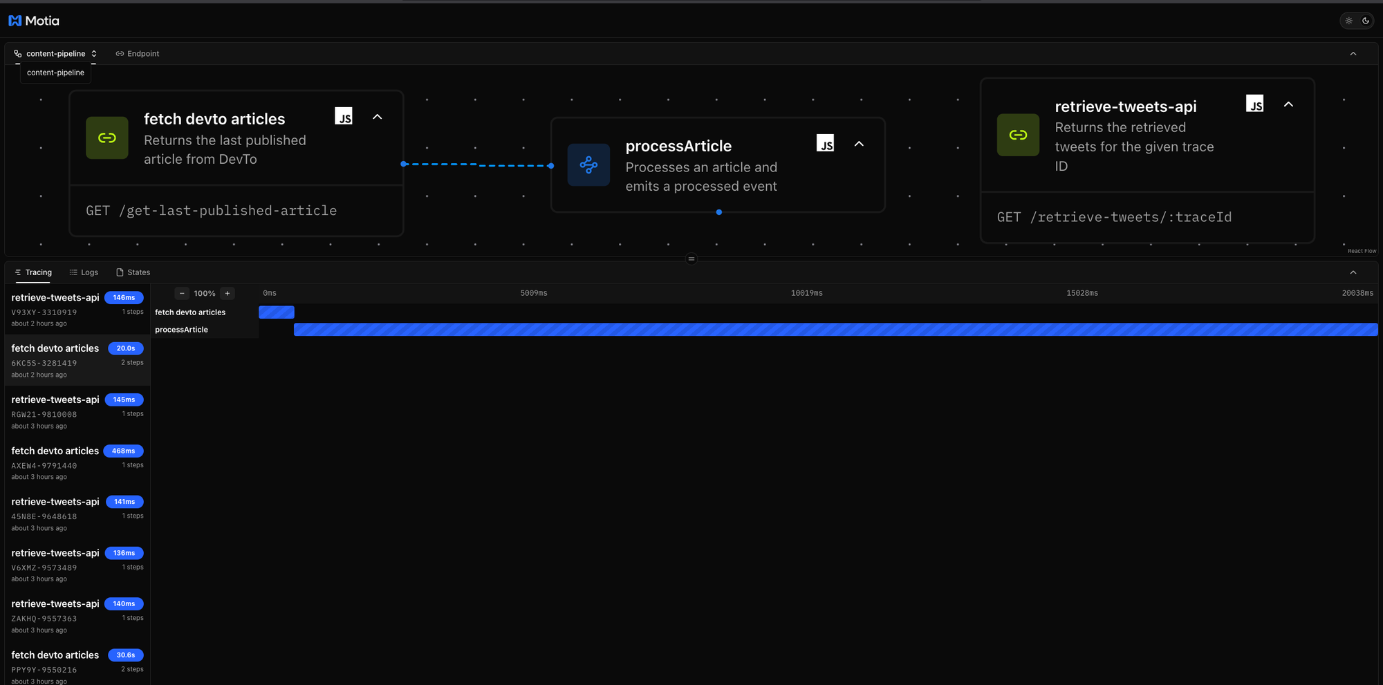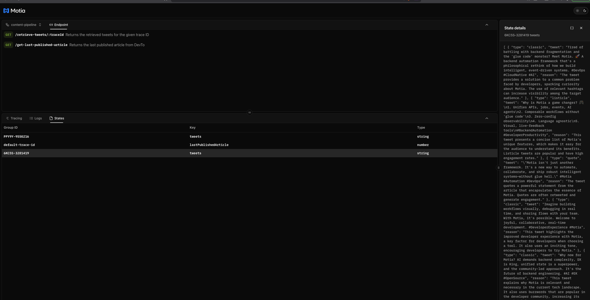 The trace ID ensures that all related data for a single article remains connected throughout the entire workflow. It uses Motia's built-in state management functionality to store and retrieve tweets.